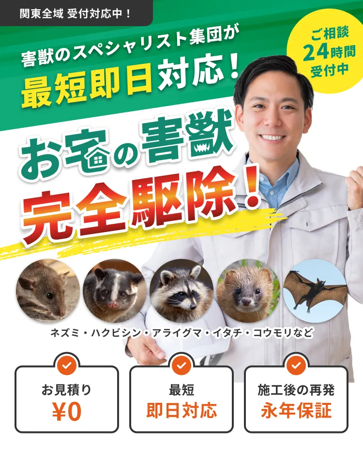 専門スタッフが現地調査を行い、害獣の種類や侵入経路を特定したうえで、状況に応じた最適な方法(捕獲・忌避・侵入口封鎖など)で安全に駆除します。駆除後は、再発防止のための対策もしっかり行います。